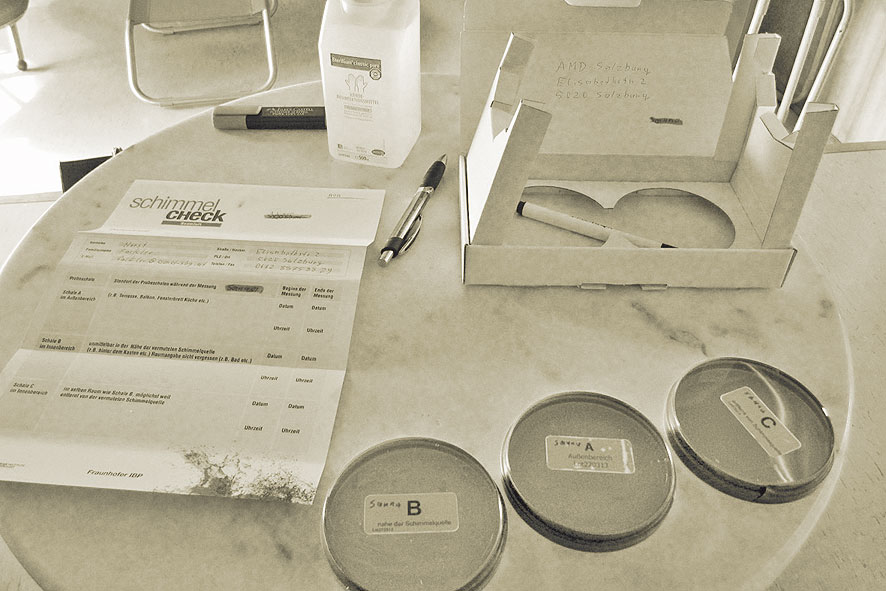Schimmelpilze können die Gesundheit schwer beeinträchtigen. Das tatsächliche Ausmaß von Schimmelbefall ist aber häufig mit bloßem Auge nicht erkennbar. Bei Verdacht auf Pilzbefall von Arbeitsräumen sollte daher ein Test durchgeführt werden.
