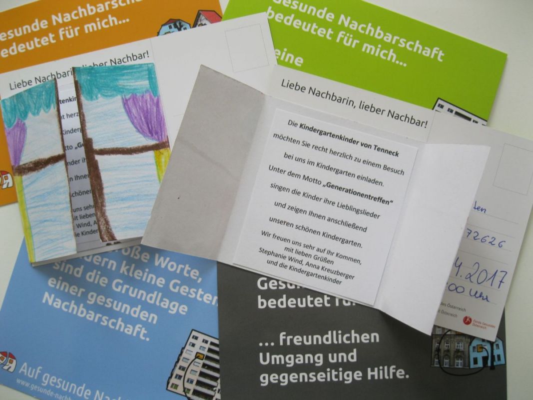 Am 25. April 2017 luden die 24 Kindergarten-Kinder von Tenneck ihre Nachbarinnen und Nachbarn zum „Generationentreffen“ in den Kindergarten. Die Rückseiten der Motivkarten des Projektes „ Auf Gesunde Nachbarschaft“ wurden als Einladung von den Kindern, der Kindergartenleiterin Stephanie Wind und der Kindergartenpädagogin Anna Kreuzberger gestaltet.