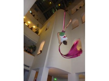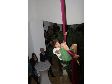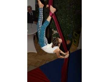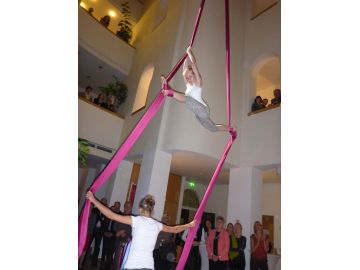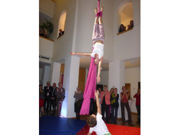 Besonderes Highlight der Feierlichkeiten war zweifelsohne die Showeinlage der Vertikaltuch-Truppe „Die bunten Hosen“. Sechs Jugendliche im Alter von elf bis 14 Jahren versetzten die ZuschauerInnen in Staunen, als sie sich mithilfe eines Tuchs in schwindelerregende Höhen schraubten. Interessantes Detail: Die jungen ArtistInnen sind größtenteils ehemalige SchülerInnen der Bewegten Volksschule Anthering, die im Rahmen dieses AVOS-Projekts die Zirkuskünste für sich entdeckten.