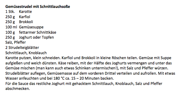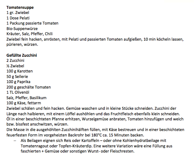 Es wurden gemäß den Anforderungen der modernen Ernährungswissenschaft vorwiegend pflanzliche Lebensmittel verwendet, reich an Ballaststoffen, Vitaminen und Mineralstoffen. Gleichzeitig wurde auch auf eine energie- und fettarme Zubereitung der Rezepte geachtet. Es galt zu vermitteln, dass die richtige Lebensmittelauswahl und eine optimale Zusammenstellung der jeweiligen Nahrungsmittel nicht nur die Konzentration, sondern auch den Erhalt der Leistungsfähigkeit über den Tag hinweg fördern. Konkrete Beispiele etwa zum Zucker- oder Fettgehalt verschiedener Lebensmittel und zum Thema Eiweißqualität wurden besprochen und auch eine informative Unterlage ausgeteilt.