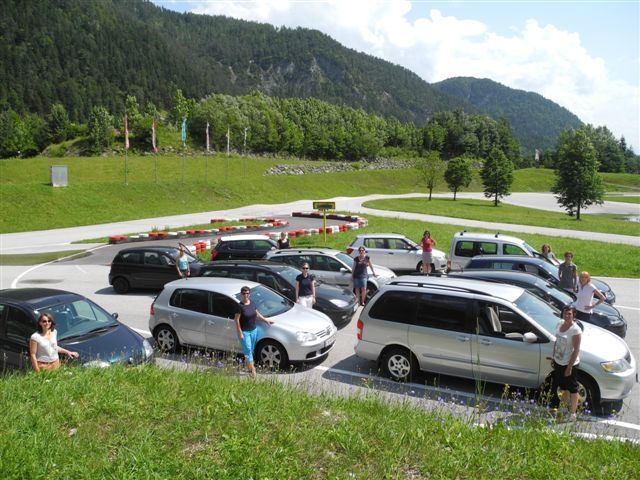 Nachdem unser Trainer Herr Erhardt, erfahren durfte, dass bei der ersten Teilnehmerin das ABS-Lämpchen dauernd aufleuchtet, die zweite zwar ein Auto mit vielen technischen Raffinessen besitzt, jedoch nicht damit umgehen kann, die dritte vorgestern mit ihrem Auto mit einem Bus kollidiert ist und die vierte vor wenigen Tagen einen Zusammenstoß mit einem Lkw hatte, ging es mit dem Fahrtraining los: Wir wurden in zwei Gruppen eingeteilt mit jeweils 11 Autos, erhielten ein Funkgerät, bei dem zwar die Stimme des Fahrtrainers gut und deutlich zu hören war, jedoch einen entscheidenden Nachteil (für uns Teilnehmende) aufwies: wir selbst konnten uns akustisch nicht bemerkbar machen.