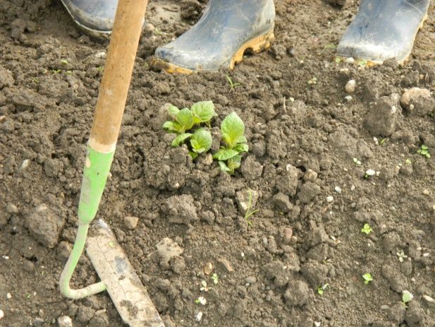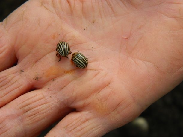 Es hat sich einiges getan seit unserem letzten Besuch: Unkraut hat sich breit gemacht. Aber auch erste Erfolge sind sichtbar. Die gesetzten Kartoffel-Triebe wachsen schon munter der Sonne entgegen. Was sich unter der Erde abspielt können wir nur erahnen. Zuerst wird der bewirtschaftete Acker vom Unkraut befreit. Da muss jeder mithelfen. Die Erde wird zerkleinert, aufgelockert und wir entdecken erstmals Kartoffelkäfer. Da die auf den Kartoffel-Pflänzchen so gar nicht wünschenswert sind, müssen wir sie leider „entfernen“.