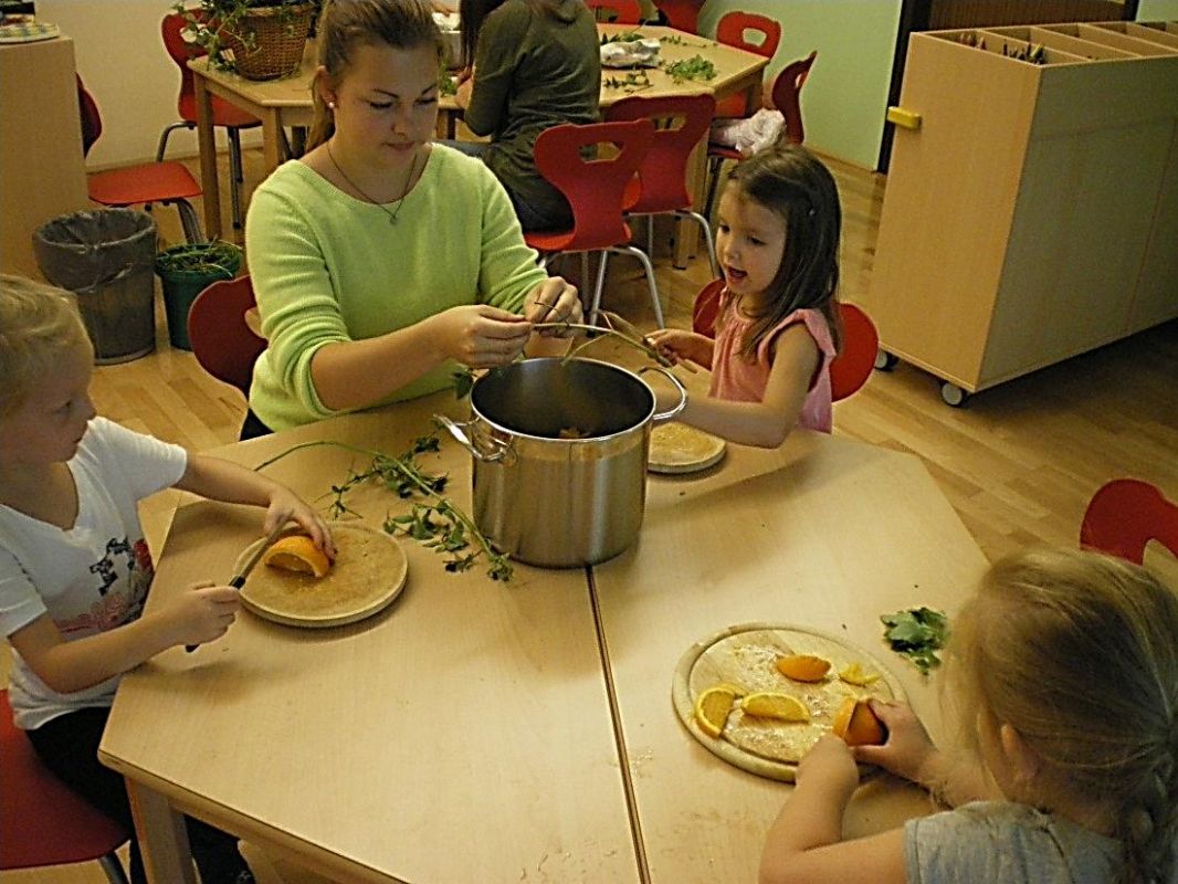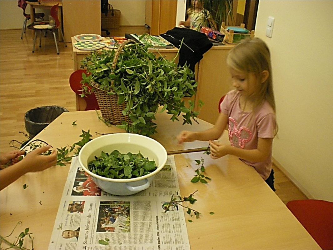 Aus den biologischen Kräutern bereiteten die Kinder selbst einen Zitronenmelissensirup zu. Während von der Kräuterschnecke noch die duftenden Kräuter geerntet wurden, waren die Kinder im Gruppenraum fleißig beim Sortieren, Zupfen und Schneiden der weiteren Zutaten.
