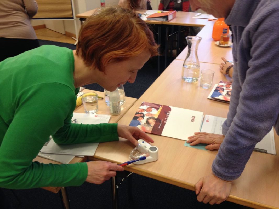 Am 24.02.2017 fand der zweite Teil des Ausbildungslehrgangs "Kindergesundheit" statt. In den ersten beiden Stunden begrüßten wir Fr. Brigitte Breinesberger, eine der AVOS Zahngesundheitserzieherinnen, als Referentin. Sehr anschaulich brachte sie den 13 Teilnehmerinnen das Thema Zahnpflege näher und gab viele Tipps für die praktische Umsetzung in den Dialogrunden. Fr. Dr. Margit Firlei war als zweite Referentin zu Gast. Sie ist Psychologin und hat im Projekt bereits als Referentin mitgearbeitet. Diesmal referierte sie über das Thema "Seelische Entwicklung von Kindern - von der Geburt bis zur Pubertät".