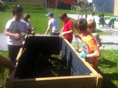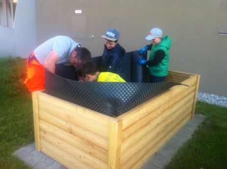 Am 22.April begannen die Kinder der 3b Klasse mit dem Befüllen der Beete. Dafür mussten wir aber vorher noch die Hochbeete mit Noppenfolie auslegen, wobei uns unser Schulwart Heli tatkräftig unterstützte. Auch ihm ein großes Dankeschön!