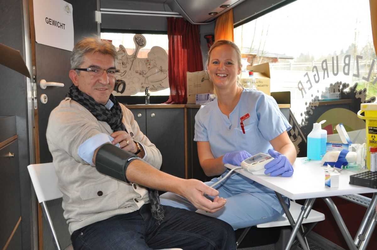 Auch die Schlotterer Sonnenschutz GmbH aus Adnet hat 2012 am ersten „Boxenstopp“ teilgenommen. Im Bild: Betriebsrat Sakir Kamber lässt seinen Blutdruck kontrollieren. / Bild: Plenos/Weinberger