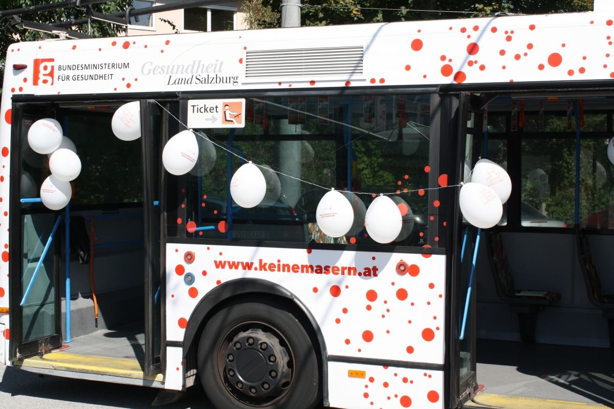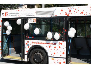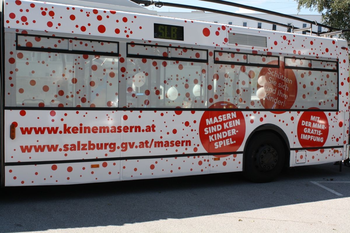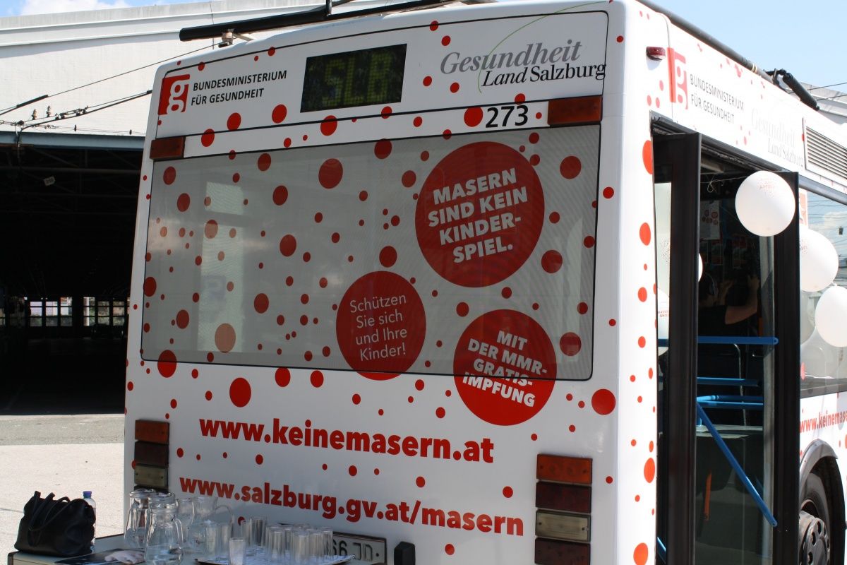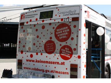 Am Donnerstag, 18. September, verteilen Gesundheitsarbeiterinnen von AVOS von 15.00 bis 18.00 Uhr in der Eingangshalle des Salzburger Hauptbahnhofs Folder und Impfgutscheine für die Gratis-Masernimpfung des Landes. Die ÖBB wirbt in den Salzburger Regionalzügen mit Plakaten des Bundesministeriums zur Teilnahme an der lebenswichtigen Gratis-Impfung, parallel werden in den Salzburger Stadtbussen Swingcards zur freien Entnahme über die Aktion informieren.