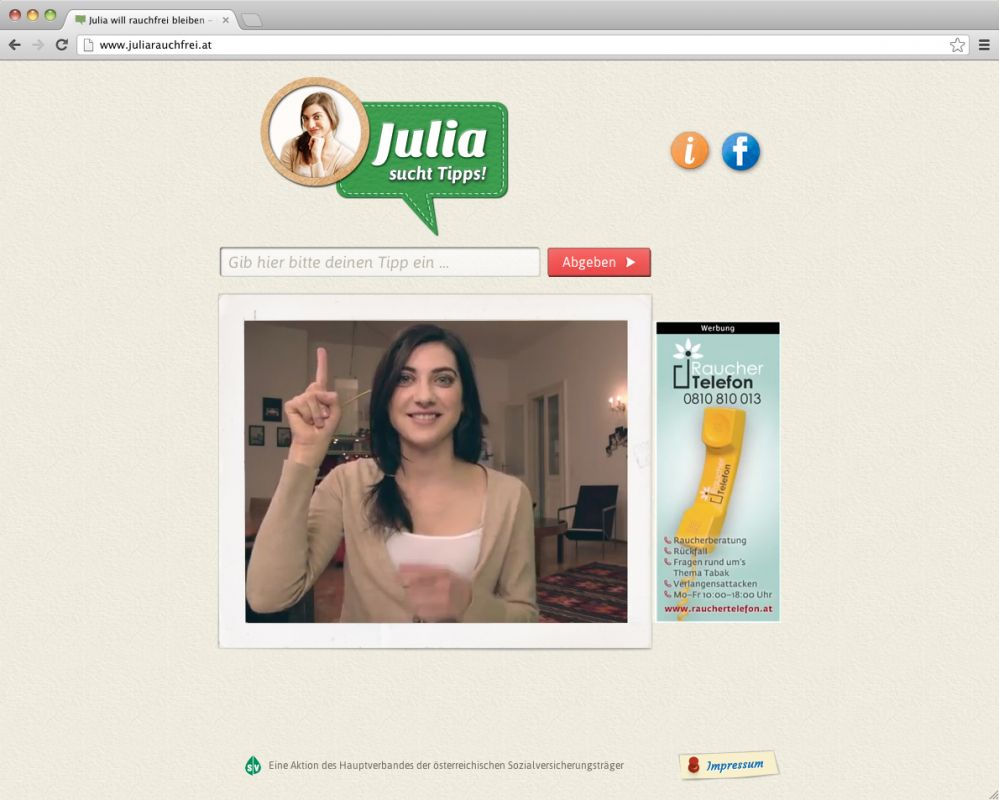 Dabei gibt man seine Tipps in ein Textfeld über dem Videofenster ein. Julia belohnt jeden brauchbaren Ratschlag mit einem unterhaltsamen Video, in dem sie den jeweiligen Tipp in die Tat umsetzt. Der Absender der Kampagne ist das Rauchertelefon, das mit "Dein Tipp für Julia" die kostenlosen Angebote bekannt machen will. Unter 0810 810 013 finden all jene professionelle Unterstützung, die den Rauchstopp ernsthaft durchziehen wollen. Denn ganz alleine schaffen es die wenigsten.