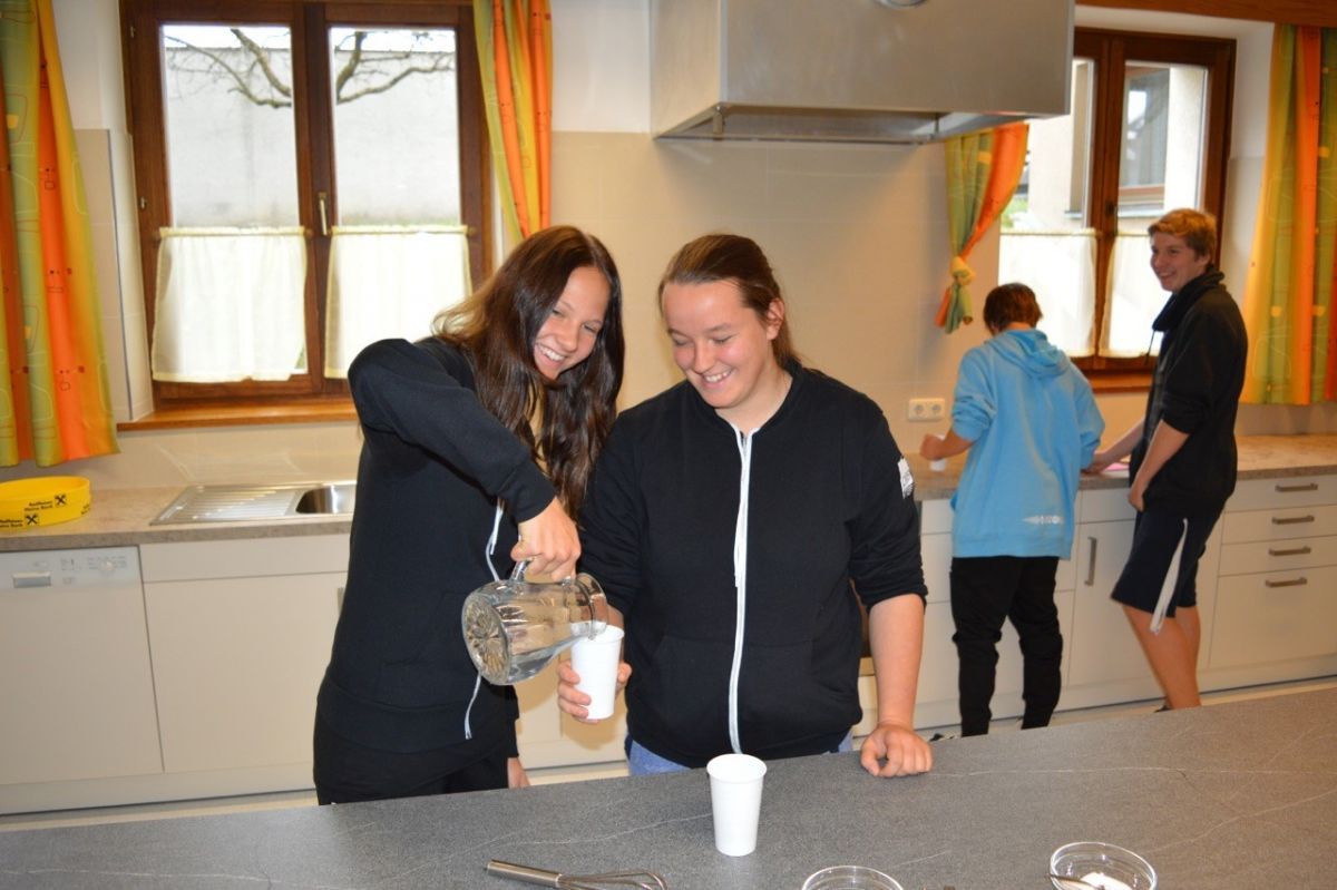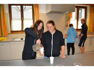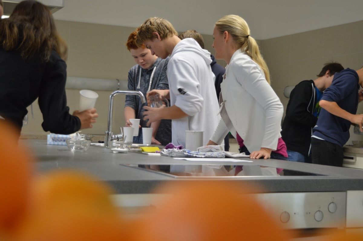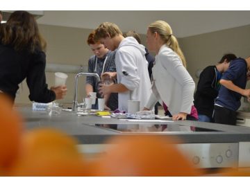 Abschließend begaben sich die SchülerInnen zur Versuchsstation, um mit der Wirkung von Zitronensäure in Limonaden zu experimentieren. Die Frage an die SchülerInnen war: Wie wird ein Getränke, dass auf 0,25 Liter 6 Stück Würfelzucker beinhaltet, genießbar? Lösung: Durch die Zugabe von Zitronensäure wird der süße Geschmack Schritt für Schritt überlagert. Das Endprodukt, oftmals versehen mit Aromen und Farbstoffen, lässt sich dann durchaus trinken.