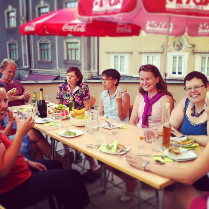 Wie weiht man einen neuen Garten ein? Richtig, am besten mit einer Party, die am 25. Juli 2013 anlässlich des City Farming bei AVOS organisiert wurde. So trafen wir uns bei strahlendem Sonnenschein, nach getaner Arbeit, für ein Gläschen Sekt, oder auch zwei, auf der Terrasse im 1. Stock. Natürlich gibt es bei uns kein Fest ohne etwas zum Schmausen und so kam es, dass wir bei selbstgemachten Tapas, Käse, frischem Brot und Gemüse von der Schranne, Obst und Süßigkeiten zugreifen konnten. Eine würdige Einweihung für unseren Garten.
