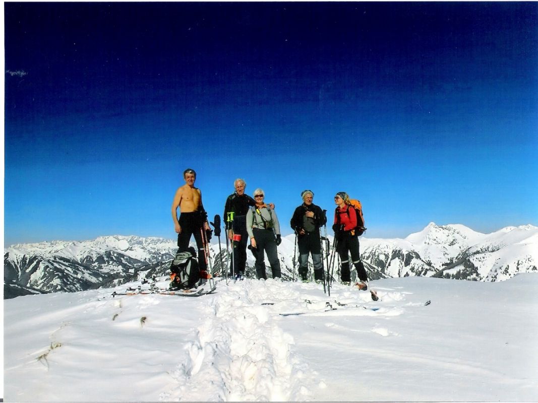 Nach einem Monat in der Reha hatte Herr A. noch nicht querbettsitzen können, aufgrund einer schweren Schluckstörung  war die Ernährung vorerst nur über eine Magensonde möglich. Es grenzt es ans Unglaubliche, wie Herr A. heute unterwegs ist. Die orale Ernährung ist wieder möglich, wenn das Schlucken auch Konzentration erfordert. Und die Berge, die dem pensionierten Gendarmeriebeamten schon immer ein Lebenselixier waren, rufen ihn wieder. Auf den Bildern (Winter 2012/13) ist er in seiner Hüttschlager Heimat auf Schitour unterwegs, dem 2.088 Meter hohen Karkogel oberhalb Hirschgrubenalm.