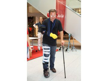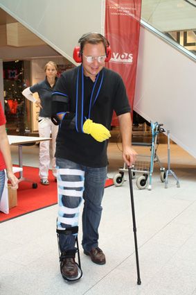 Die Simulation von Beeinträchtigungen nach einem Schlaganfall geht auf das Konzept des Instant Ageings zurück, das 1974 von Leon Patalan ursprünglich für die Krankenpflegeausbildung entwickelt wurde. Ziel der Methode ist es, jungen Menschen mit einfachen Hilfsmitteln wie Bandagen, präparierten Brillen etc. zu zeigen, welche Schwierigkeiten und Einschränkungen ältere Menschen im Alltag haben und wie sie diese bewältigen können. Sabine Stadler, Ergotherapeutin und Bereichsleiterin Prävention und Vorsorgemedizin bei AVOS nutzte diese Methode, um für die BesucherInnen des FORUM 1 das Leben von SchlaganfallpatientInnen zu simulieren: „Das TherapeutInnen-Team von AVOS arbeitet ambulant und mittels Hausbesuch mit Schlaganfall-PatientInnen. Für den heutigen Aktionstag haben wir das Konzept von Leon Patalan für unsere Bedürfnisse abgewandelt. Wir wollen Menschen die Möglichkeit bieten am eigenen Leib die Auswirkungen eines Schlaganfalls zu erfahren, auch wenn eine vollkommene Simulation nie möglich sein wird.“