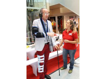 Am ersten Tag der Gesundheitswoche im FORUM 1 bekamen BesucherInnen beim „Extreme Ageing“ ein Gefühl davon, wie sich das Leben nach einem Schlaganfall anfühlt. Die Ergo- und PhysiotherapeutInnen von AVOS verkleideten die BesucherInnen mit Bandagen, Schienen, Handschuhen, präparierten Brillen und zeigten ihnen, welche Hürden Menschen mit Beeinträchtigungen nach einem Schlaganfall im Alltag bewältigen müssen. Die BesucherInnen konnten sich zudem über das Angebot der ambulanten Schlaganfalltherapie von AVOS informieren und sich zum Thema Demenz vom Gesundheitsinformationszentrum (GIZ) der Salzburger Gebietskrankenkasse beraten lassen.