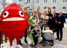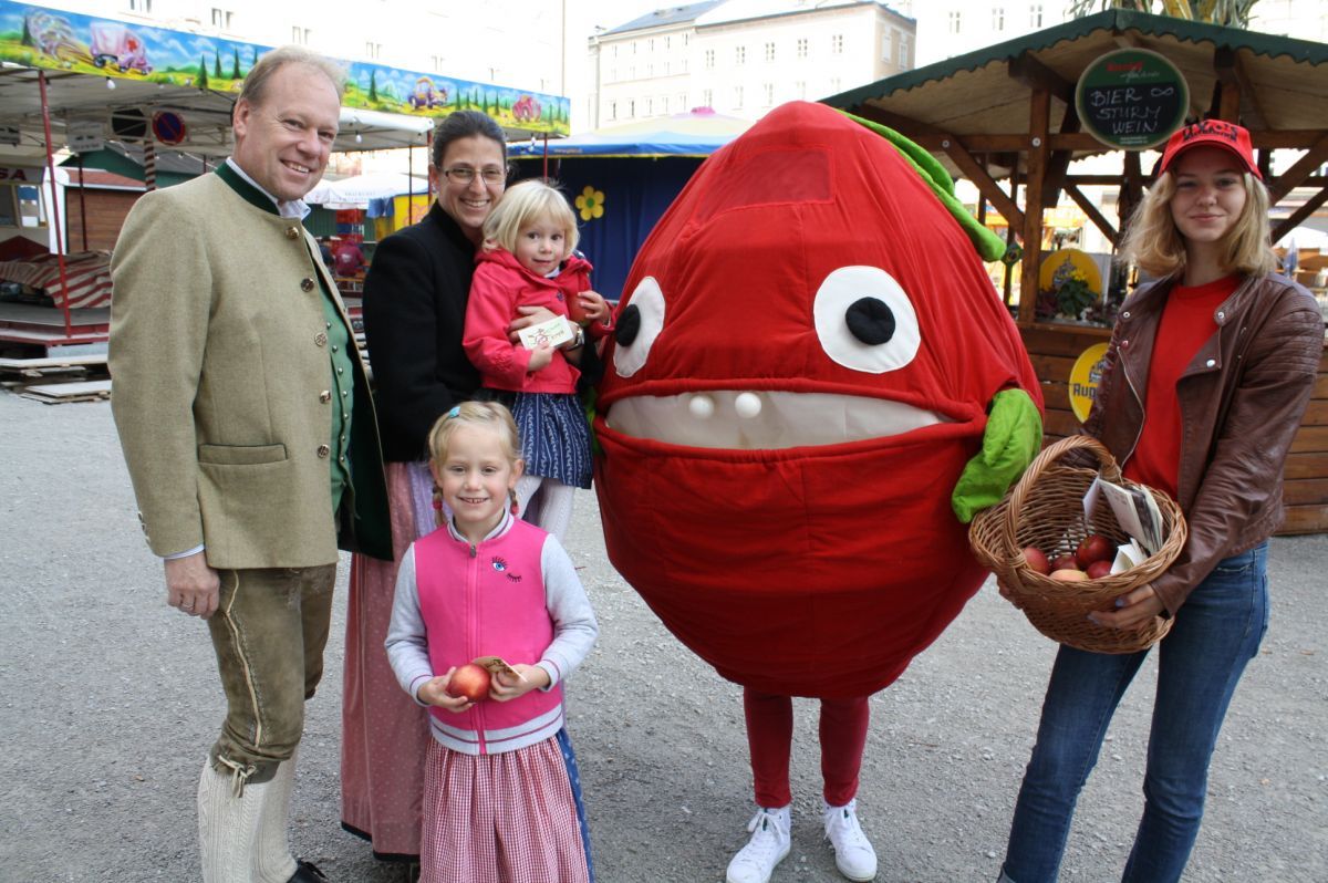 Ein Herz für gesunde Zähne hat Avolino, das Maskottchen der Zahngesundheitserziehung von AVOS Prävention und Gesundhheitsförderung: Deshalb verteilte der lebensgroße rote Apfel am Sonntag, den 24. September 2017 rund um den Salzburger Dom Bio-Äpfel aus Salzburg an alle Kinder. Damit soll zum Tag der Zahngesundheit ans richtige Zähneputzen erinnert werden, damit bei den vielen süßen Genüssen auch die Zähne gesund bleiben. Denn der Tag nach Ruperti, der 25. September, ist der Tag der Zahngesundheit und sozusagen der Geburtstag von Avolino: Denn er besucht in einem Team von 25 ZahngesundheitserzieherInnen im Auftrag des Landes Salzburg und der Sozialversicherungsträger zwei Mal im Jahr die Kinder in allen Kindergärten und Volksschulen im Land Salzburg und bringt den Kindern bei, warum richtiges Zähneputzen so wichtig ist. Auf dem Foto v.l.: Avolino and friends mit (2.Reihe v.l.n.r.) Landessanitätsdirektorin HR Dr. Heidelinde Neumann, Dr. Harald Seiss, Direktor SGKK , DDr. Michael Franzelin, Zahnärztekammer, mit Partnerin Dr. Silvia Trtan und Sohn Felix, Mag. Angelika Bukovski, AVOS und LH-Stv- Dr. Christian Stöckl.