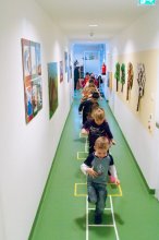 Seit Jänner haben wir im Kindergarten Neue Heimat eine Hüpfstraße, die in einem Rundgang durch das ganze Haus führt. Die zwei langen Gänge (im Erdgeschoß...