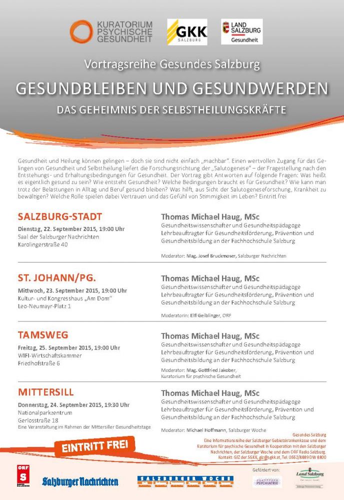 Sie erhalten Antworten auf folgende Fragen: Was heißt es eigentlich gesund zu sein? Wie entsteht Gesundheit? Welche Bedingungen braucht es für Gesundheit? Wie kann man trotz der Belastungen in Alltag und Beruf gesund bleiben? Was hilft, aus Sicht der Salutogeneseforschung, Krankheit zu bewältigen? Welche Rolle spielen dabei Vertrauen und das Gefühl von Stimmigkeit im Leben?