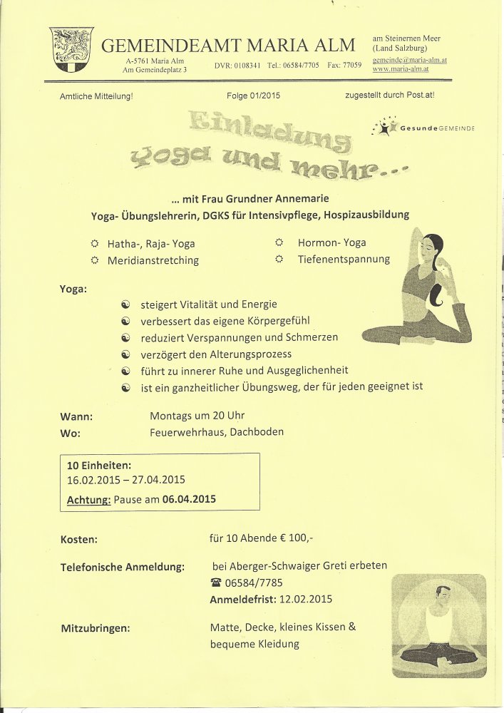 Wir freuen uns, dass Frau Grundner die Tradition der Yogakurse in Maria Alm fortsetzt! Immer Montags, 20 Uhr im Feuerwehrhaus, Dachboden