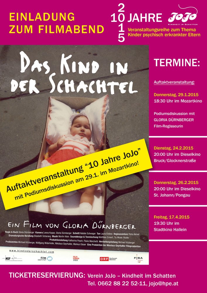 Unser Verein JoJo - Kindheit im Schatten feiert heuer sein 10jähriges Bestehen. Aus diesem Grund - und um verstärkt auf die Situation von Kindern von psychisch erkrankten Eltern aufmerksam zu machen - laden wir zu einer Veranstaltungsreihe beginnend am 29. Jänner 2015 im Mozartkino. Hier zeigen wir den preisgekrönten Film "Das Kind in der Schachtel" und diskutieren mit Regisseurin Gloria Dürnberger und ExpertInnen.